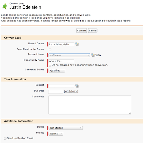 Seems simple enough right? Create a record and convert it into three records. There are however some nuances that are what I would call limitations in the flow of Conversion. Here are some of my bugaboos with Lead Conversion and some Ideas for how to solve some of them.