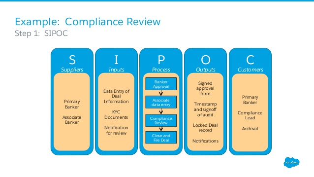 It all begins with having a clearly defined and documented process. As noted in the Salesforce Getting Started Workbook, it’s critical to capture your sales process when you are just getting started. Don’t be put off by the “selling” terminology in the workbook; instead focus on the critical steps in your process. If you haven’t put them on paper, now is the time. It need not be fancy-schmancy either. What is important is that you capture the step-by-step activity performed by your team end to end. A good webinar for reference is “Business Process Mapping for Salesforce Admins.” Watch and identify what the tools are that work for you and your organization. I’m a fan of the SIPOC diagram,along with a simple bulleted document that captures each step in the process.