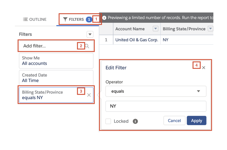 In a report, a user can determine which fields to display as columns (1-2-3) based on the relationship between a primary object and its related object(s). This differs from list views that operate on a one-object basis. With reports the user can group results (4), sort the results (rows) (5), and include a chart (6), and enter filter criteria.